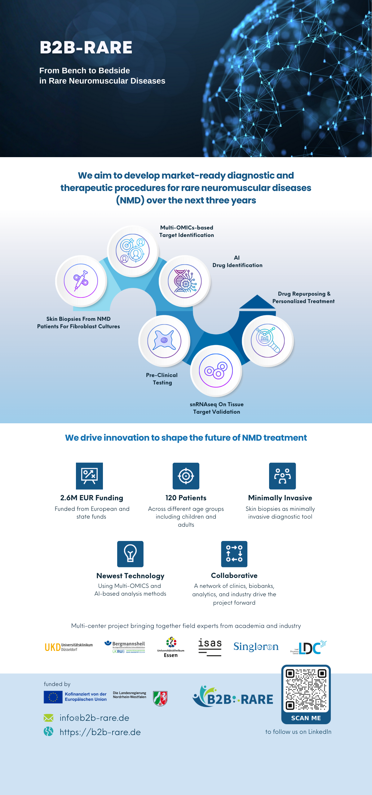 NRW, [28 Oktober, 2024] – Das Konsortium „B2B-RARE – Bench to Bedside“ hat im Rahmen des Innovationswettbewerbs Gesünder.IN.NRW eine Förderzusage im Bereich Innovative Medizin, Gesundheit und Lebenswissenschaften erhalten. Das mit mehr als 2,6 Mio. Euro aus europäischen und Landesmitteln geförderte gleichnamige Projekt will durch von Patient:innen gewonnene Hautzellen in den kommenden drei Jahren marktreife Diagnose- und Therapieverfahren für seltene neuromuskuläre Erkrankungen (NME) entwickeln.
